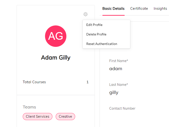 Select company on top bar > people > select the profile of the learner > select the settings icon > select reset authentication > Select Reset
